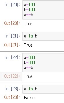 a=b=300일 때는 서로 다른 메모리 주소를 가지므로 a is b가 False가 나옴