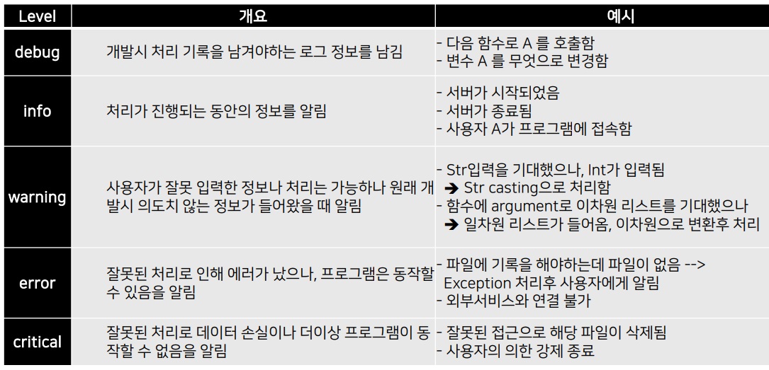 레벨별(개발시점,운영시점 등)로 로그 기록을 남길 수 있음
