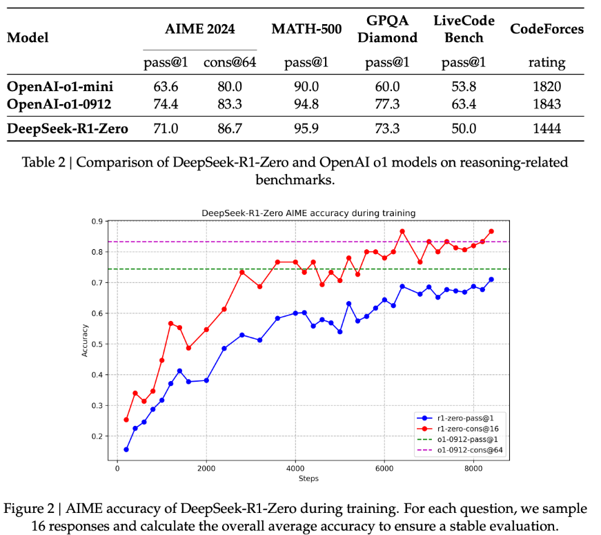 DeepSeek-R1-Zero는 초기 데이터 없이 순수 RL 접근 방식만으로 강력한 성능을 달성했습니다.