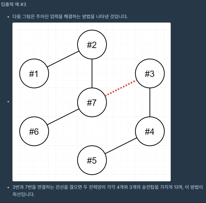 wires의 각 원소는 [v1,v2] 2개의 자연수로 이루어져 있으며 이는 전력망의 v1번 송전탑과 v2번 송전탑이 전선으로 연결되어 있다는 것