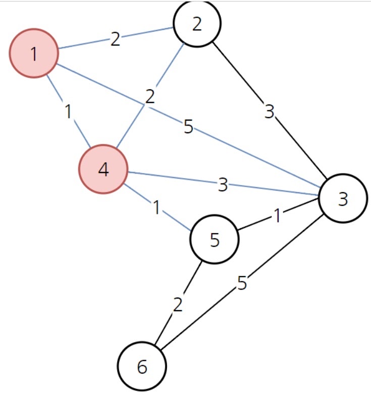 이 때 1번에서 4번을 반드시 거쳐서 2번, 3번, 5번, 6번 노드로 가는 최소 비용을 구하여 배열을 갱신함