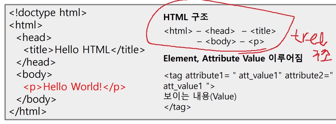 태그 사이에 원소 값이 포함 <title> hello, world </title>
