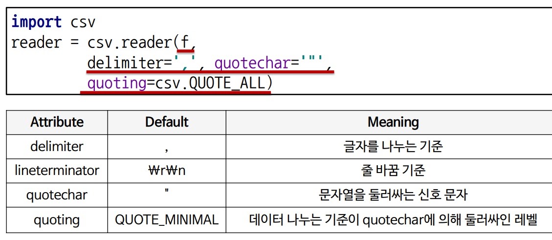 파이썬에서는 csv객체를 이용해서 csv파일을 처리할 수 있음