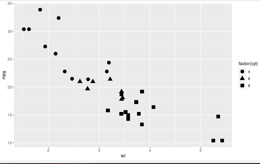 geom_point(aes(shape=factor(cyl)))로 주면 factor 변수에 따라 요인별로 점의 모양을 다르게 함