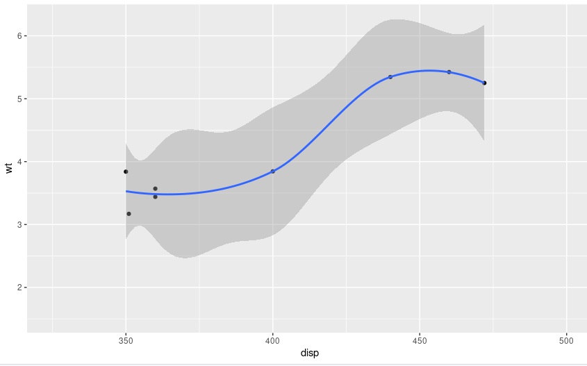 > p <- qplot(disp, wt, data=mtcars) + geom_smooth()
