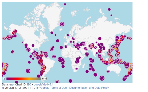 > g9 <- gvisGeoChart(eq,'loc', 'DEPTH', 'MAG', options=list(displayMode='Markers', colorAxis="{colors:['purple','red','orange','grey']}",
