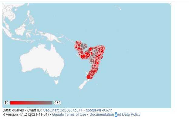 > g7 <- gvisGeoChart(quakes, 'latlong', 'depth', 'mag', options=list(displayMode='Markers', region='009', colorAxis="{colors:['red', 'grey']}",