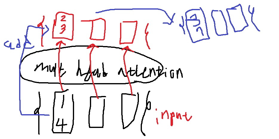 input의 (1,4)의 multi head attention 결과로 얻은 (2,3)에 단순히 더하여 (3,7)이라는 벡터를 얻는 과정이 residual connection이다.