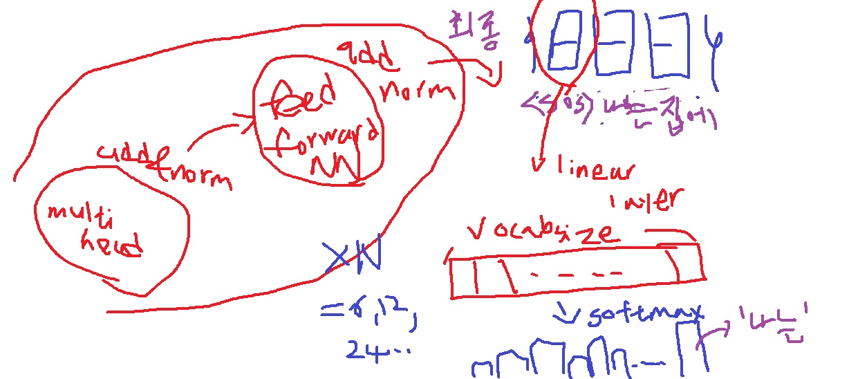 그리고나서 encoder-decoder multi head attention으로 들어가서 encoder의 최상단 hidden vector로부터 key,value를 받아와 이전 layer에서 만들어진 decoder의 query와 attention을 수행하는 것이었다.