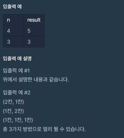 효진이는 멀리 뛰기를 연습하고 있습니다. 효진이는 한번에 1칸, 또는 2칸을 뛸 수 있습니다. 칸이 총 4개 있을 때, 효진이는 (1칸, 1칸, 1칸, 1칸) (1칸, 2칸, 1칸) (1칸, 1칸, 2칸) (2칸, 1칸, 1칸) (2칸, 2