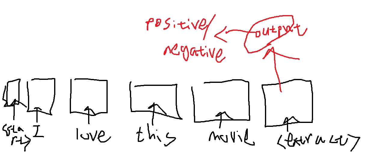 이들의 self-attention을 통해 <extract> token이 최종적으로 encoding된 hidden vector를 뽑아내면 그것을 ouput layer에 넣어서 문장의 sentiment에 대한 binary classification을 수행한다.
