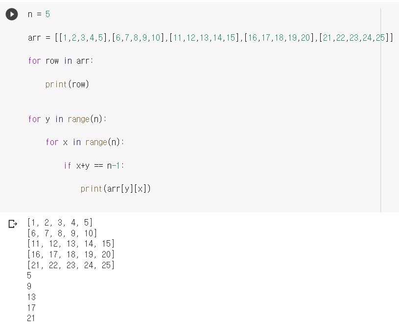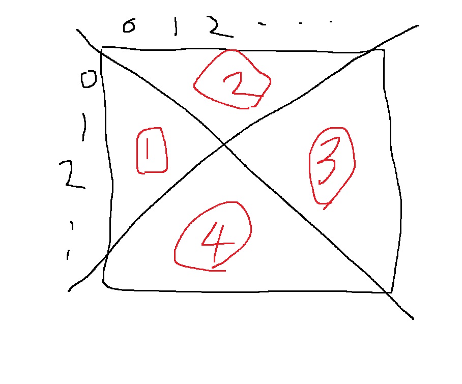 오른쪽 위에서 왼쪽 아래로 내려가는 대각선은 x+y == n-1인 부분이니까..
