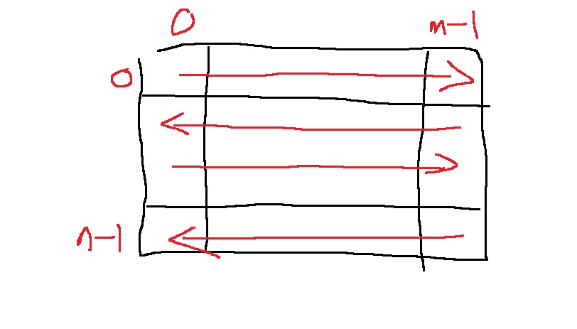 행 y가 짝수이면.. 0~m-1 순회하고 홀수이면 m-1~0 순회하도록