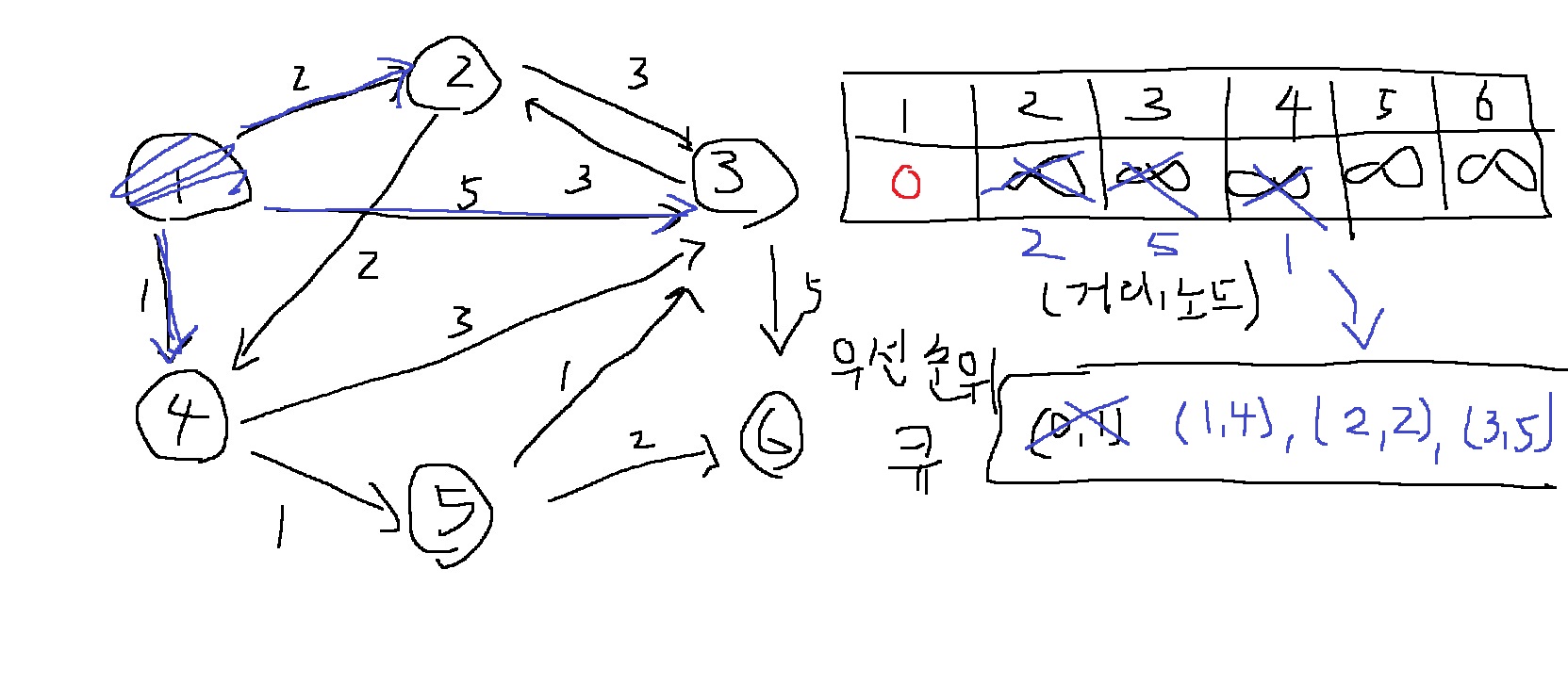 이후에 우선순위 큐에 1번 노드를 넣는다. 이때 1번 노드로 가는 거리는 자기 자신까지 도달하는 거리이므로 0이다.