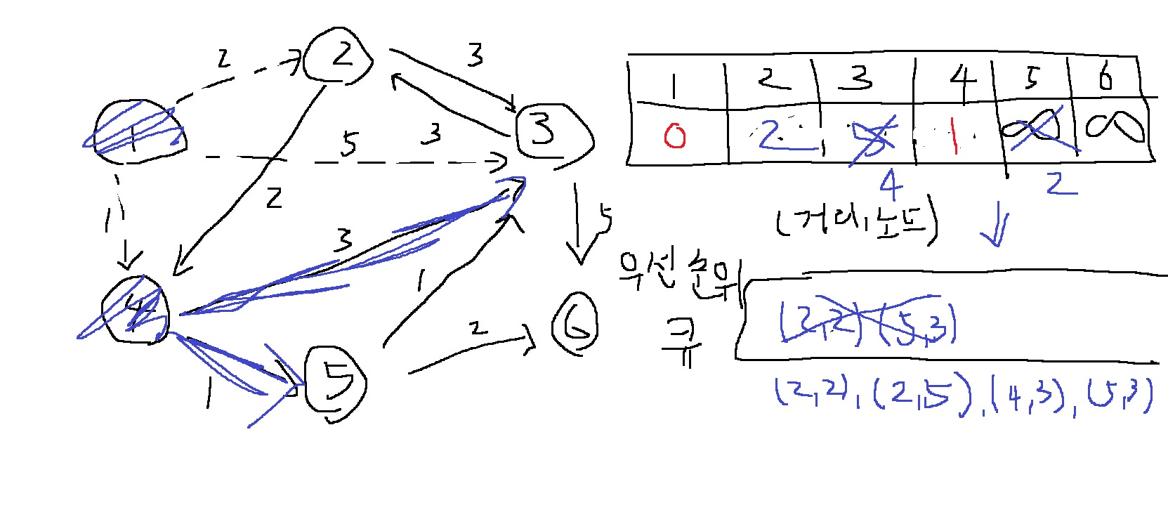 4번 노드까지의 최단거리는 1이고 연결된 3,5번까지의 최단거리는 1+3=4, 1+1=2이다.