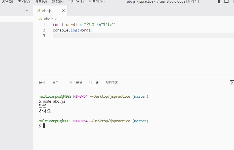 그래서 escape sequence \n를 삽입하면 줄바꿈이 가능함