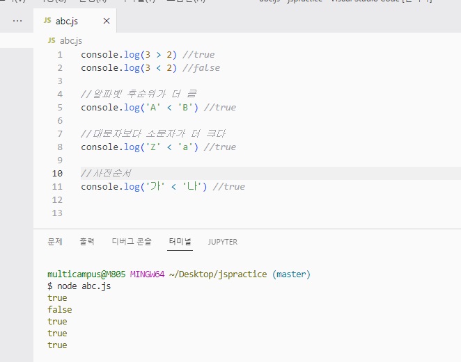 피연산자들(숫자, 문자, boolean 등)을 비교하고 결과값을 boolean으로 반환함