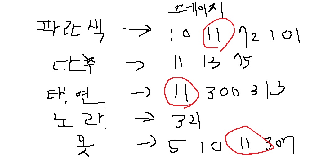 이 경우 파란색, 태연, 옷이 모두 속한 페이지를 찾아서 보여주면 됩니다. 11페이지 하나밖에 없습니다.