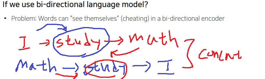 그래서 단순하게 bidirectional하게 modeling하면? 정답을 모두 안다는 것이 또 문제다.