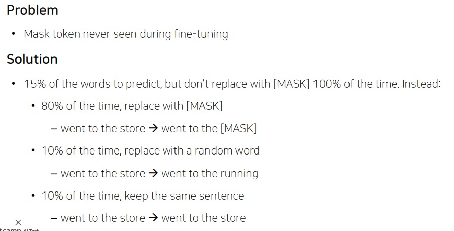 그리고 나머지 10%인 1.5단어정도는 <mask>가 아닌 random한 word로 바꿨다.