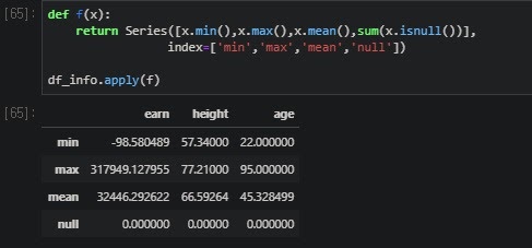 map이 series에 적용을 했지만 apply는 하나의 dataframe에서 함수를 series별로 적용시킴