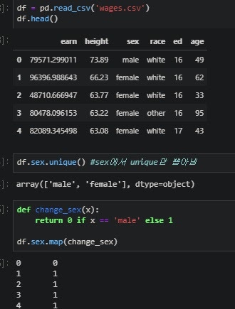 df의 sex 열에 map을 활용하여 남자면 0 여자면 1을 대응시키는 one hot encoding을 수행