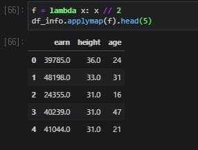 apply가 series별로 적용했다면 applymap은 dataframe 전체에서 개별요소에게 함수 적용