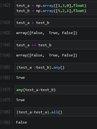 당연히 element wise 비교하니까 두 array의 크기는 동일해야하고 결과는 크기가 동일한 boolean array가 나옴