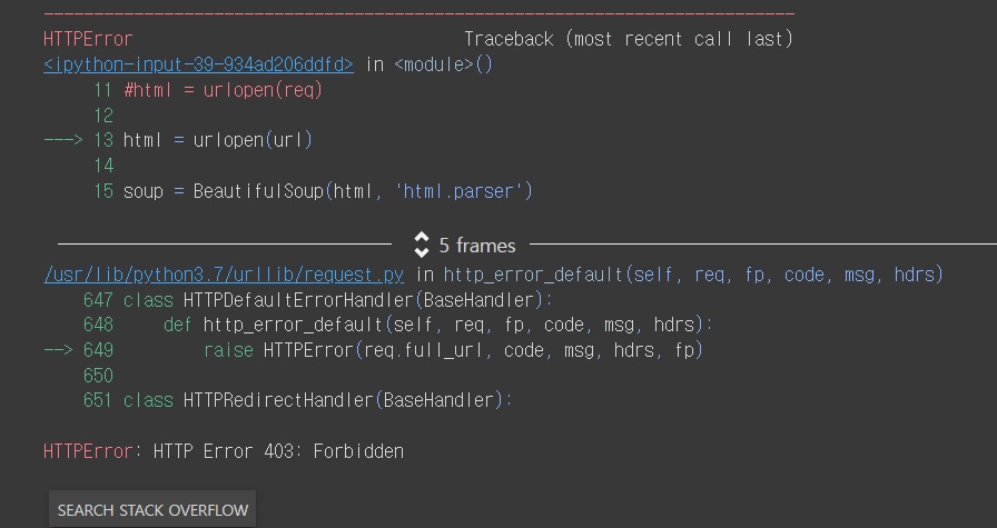 urllib.request error - urlopen()이 되지 않을 때 (크롤링 '403 Forbidden'오류 해결, http응답코드 출력하기)