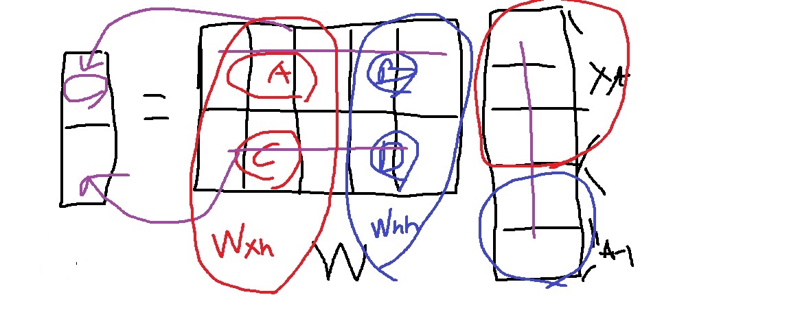 그래서 A와 C의 합을 $W_{xh}$라 하고 B와 D의 합을 $W_{hh}$라고 표시하여