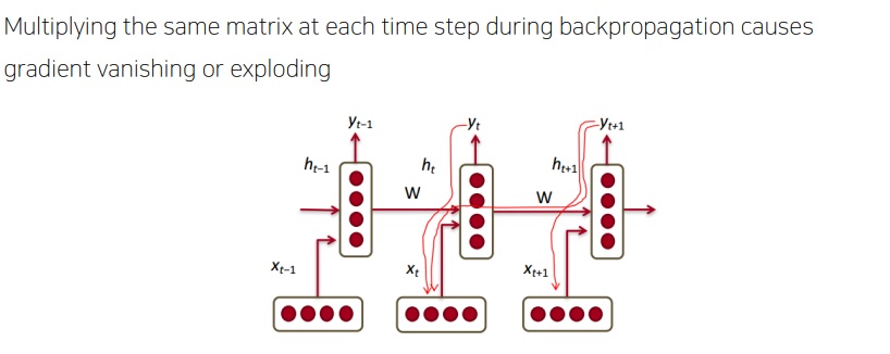 그러나 RNN은 가중치가 반복적으로 곱해진다는 사실에서 backpropagation을 할때 가중치의 곱이 1보다 크면 gradient가 폭발적으로 증가할 것