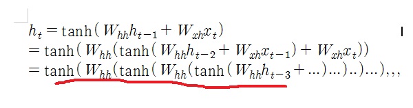 위와 같이 반복적으로 $W_{hh}$가 곱해질 것이며 $h_{t}$로 실제 값을 예측하니까 $W_{hh}$에 의한 미분을 수행