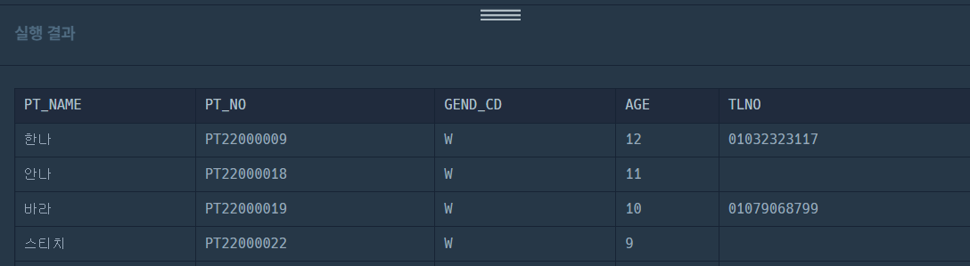 코딩테스트 연습 - 12세 이하인 여자 환자 목록 출력하기 | 프로그래머스 스쿨 (programmers.co.kr)