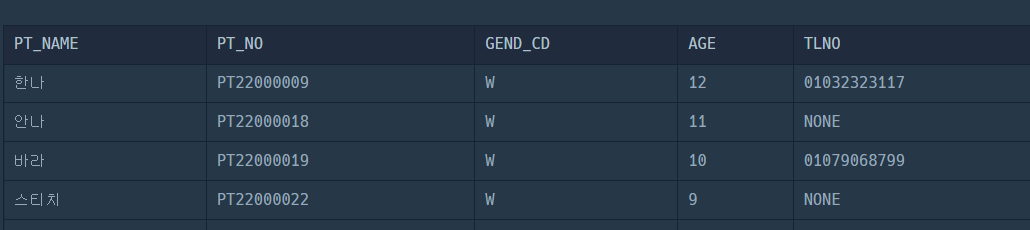 SELECT PT_NAME, PT_NO, GEND_CD, AGE, IF(TLNO IS NULL, 'NONE', TLNO) AS TLNO FROM PATIENT