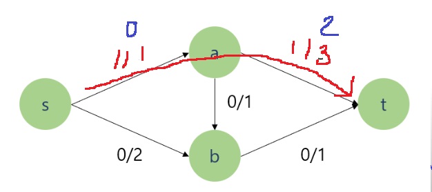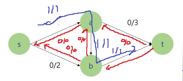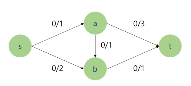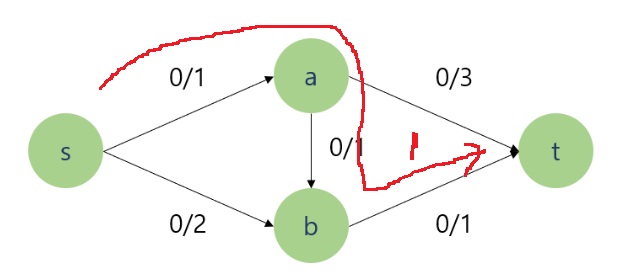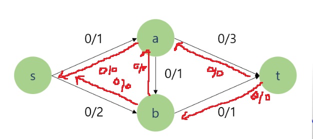 그래서 s > a로 가는 간선은 존재하지만, a > s로 가는 간선은 존재하지 않으므로 용량이 0인 간선을 그린다면...