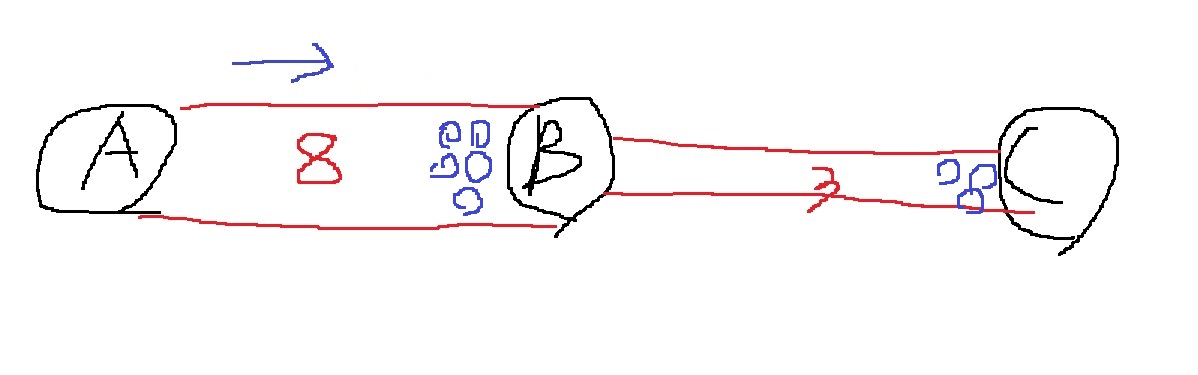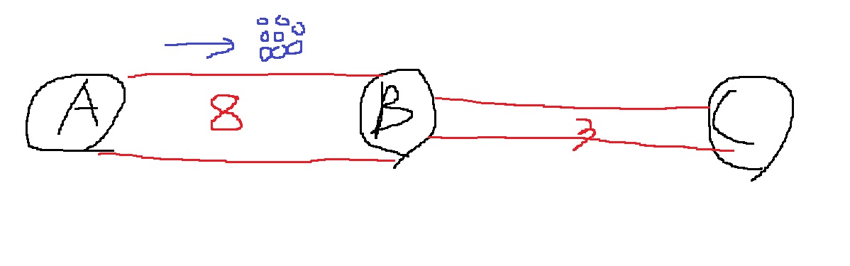 A에서 B까지 8명이 지나갈 수 있고, B에서 C까지 3명이 지나갈 수 있다고 해보자.