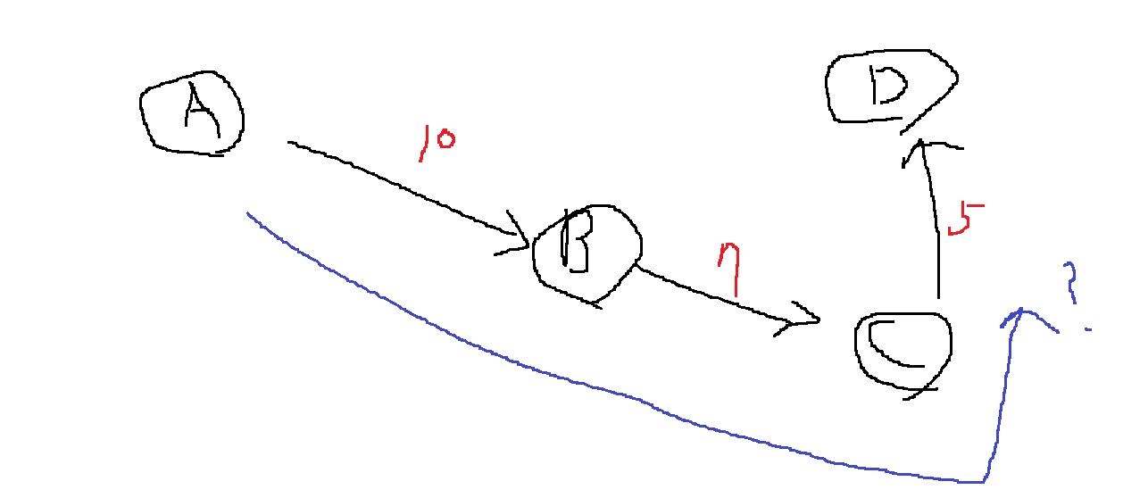 다음과 같은 그래프에서 A에서 D로 막힘없이 흐르도록 하는 최대한 많은 유량을 보내고자 할때, 얼마일까?