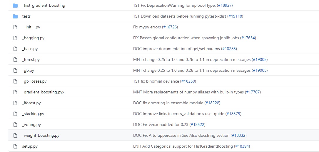 sklearn/ensemble 폴더 들어가면 존재하는 다양한 모듈들의 모습