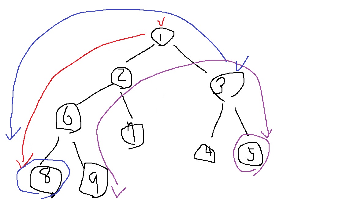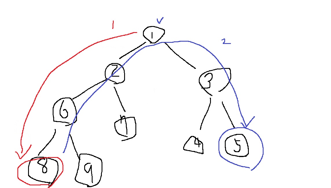 8번부터 시작해서 9번, 7번, 4번, 5번 노드로 각각 탐색하면서 길이를 구할텐데,