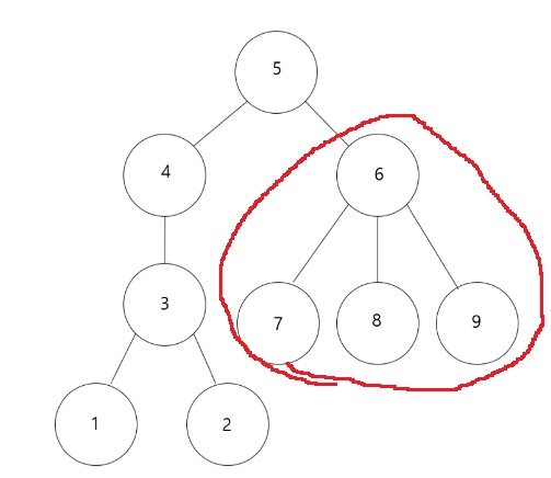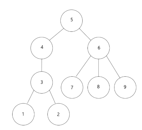 5번이 4,6을 자식으로 가지고 4번이 3을 자식으로 가지고 3번이 1,2를 자식으로 가지고 6번이 7,8,9를 자식으로 가진다.