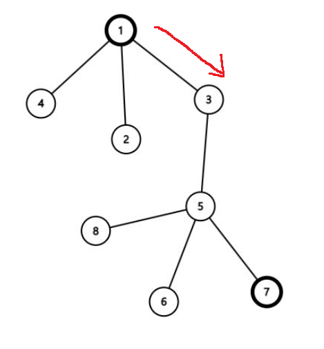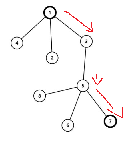 다음 트리에서 1부터 시작해서 7로 가는 경로 위 정점을 찾을려고 하는데,