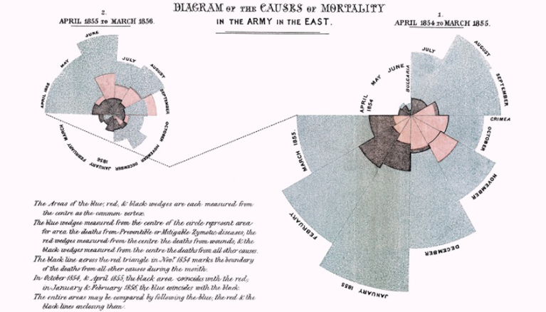 나이팅게일은 치료소에서 죽은 군인들의 사망 원인을 기록해 표와 그래프로 만들었다.