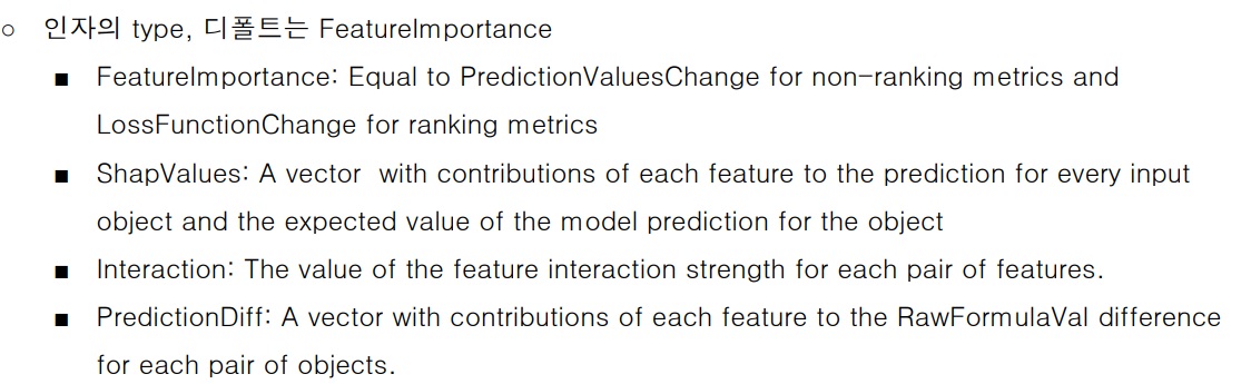 type으로 중요도 계산 방식을 설정할 수 있는데 CatBoost는 조금 특이하다..