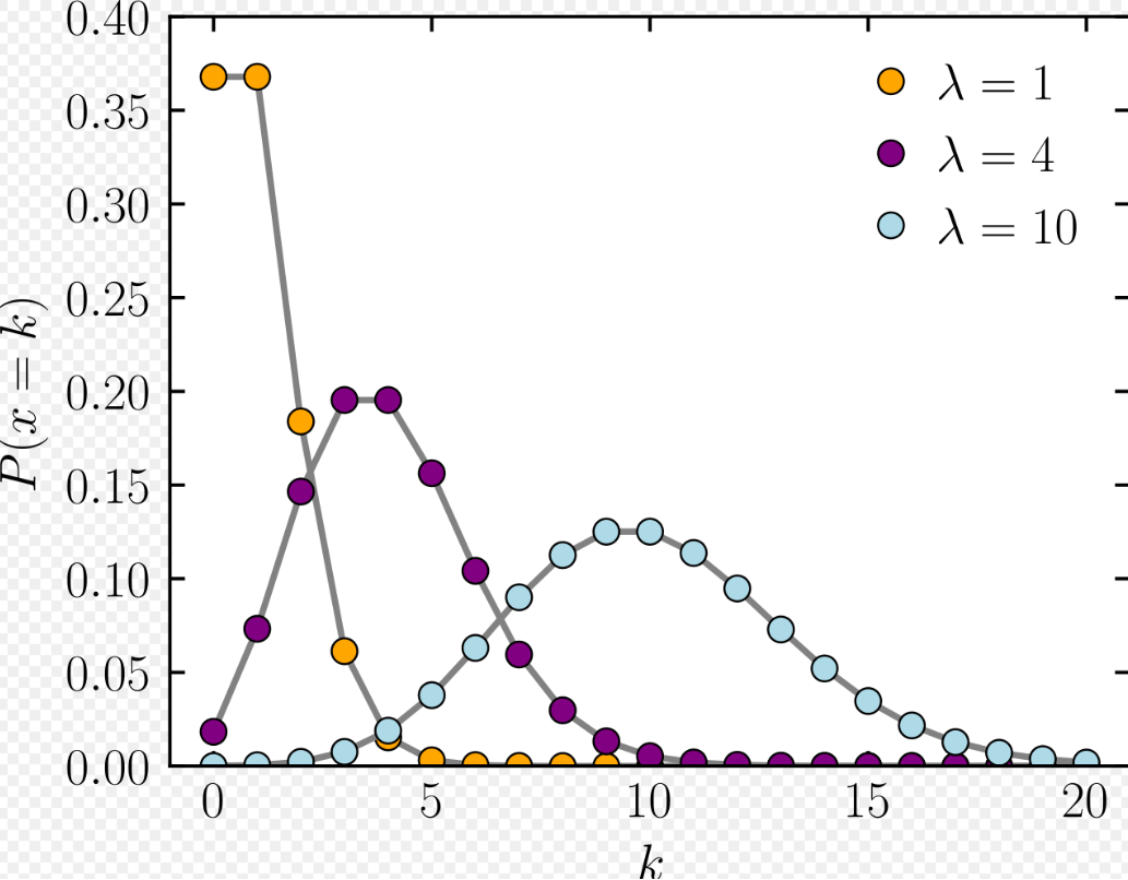 포아송 분포: 단위 시간에 어떤 사건(포아송 사건)이 발생하는 횟수가 따르는 확률분포