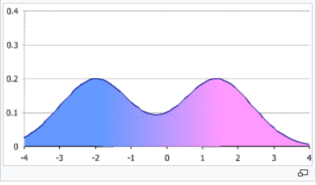 쌍봉 형태의 위 분포는 가운데 값인 25명일 가능성은 작다는 뜻으로 생각할 수 있다.