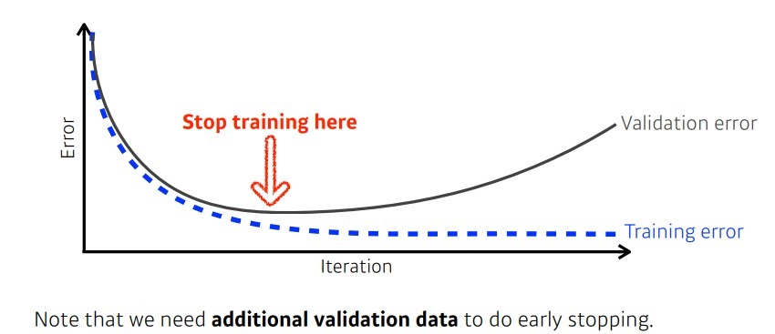 Early stopping은 iteration이 증가할 수록 test error는 증가하니 증가하기 전에 멈추자는 원리