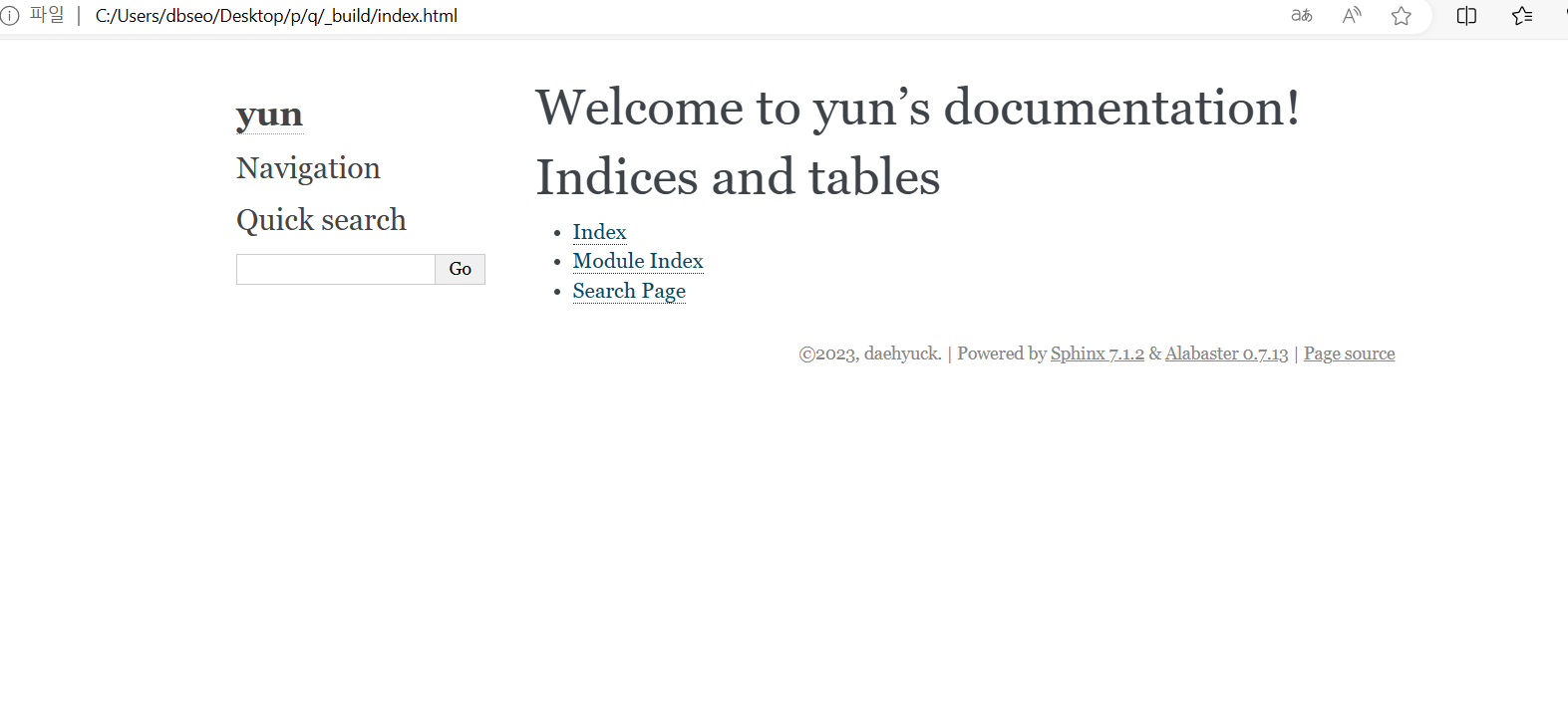 sphinx-build (source파일이 있는 폴더 경로) (빌드한 html 폴더를 위치시킬 경로)