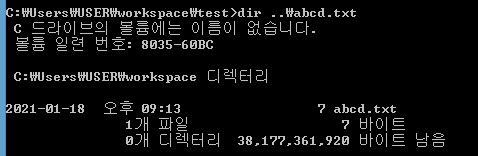 …./workspace/test/dir ..\abcd.txt : 현재 폴더(test)에서 한칸 앞(..\) workspace폴더로 이동한 뒤 abcd.txt파일을 설명