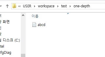 …./workspace/test/one-depth/copy ..\..\abcd.txt .\: 현재 폴더(one-depth)에서 두칸 앞(..\..\) workspace내 abcd.txt 파일을 현재 폴더(.\) one-depth내에 복사
