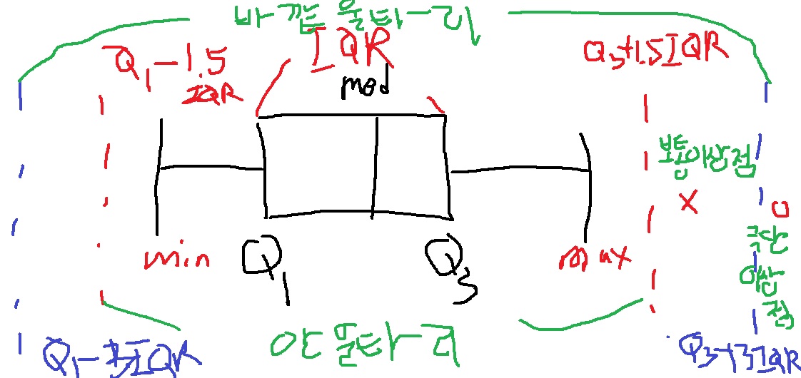 (Q1-1.5IQR,Q3+1.5IQR)은 안울타리이고 여기서 최댓값과 최솟값을 이어서 BOXPLOT을 완성함